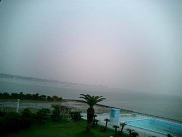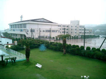 津屋崎。もう、駅の周りには何も見えず、傘が1本のみで大雨は心細く |