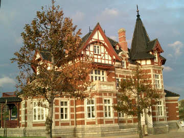 | 1段下の右に写ってる人力車の兄ちゃんの解説では図書館。「こんなにかわいい図書館は他にはない」とのこと。たしかに、金が余ってるんならこういう家が絶対欲しいわね。でも、後ろのビル、じゃま。 |
