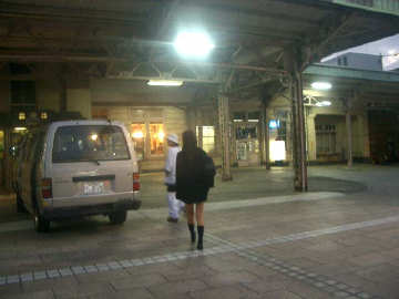 | 黄昏の門司港駅舎。上部(屋根部分)の窓に赤い灯がついているのは、やっぱり九州鉄道終点だから列車のテールランプに見立てたのか |