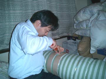 布団を粗大ゴミではなくてフツウのゴミに出すために切ります。やればできるのねえ。10年ものの布団は既に綿が切れてホコリとなり・・・
