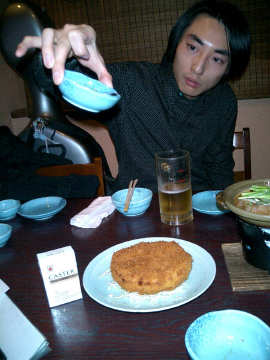 ジャンボコロッケにソースをかける